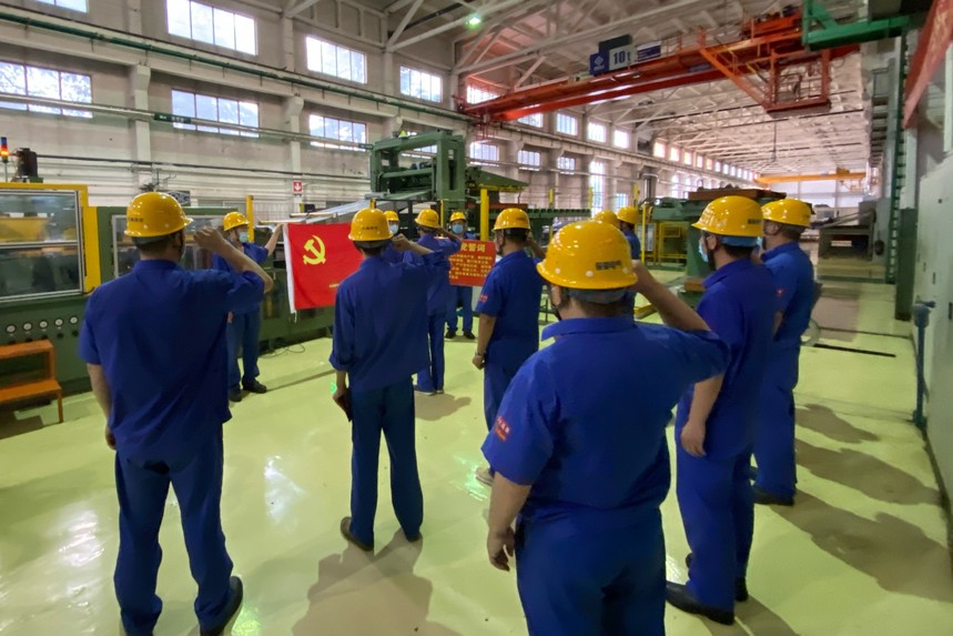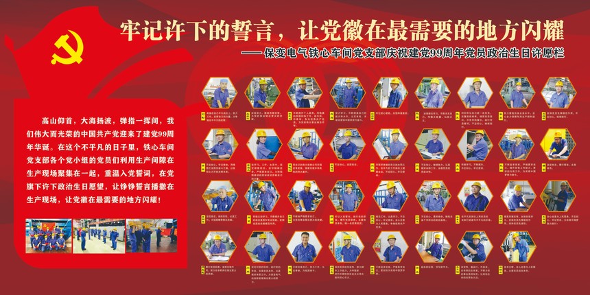 服务生产经营。结合车间生产经营实际,在重难点产品的铁心生产制造中,支部充分发挥战斗堡垒作用,多次承揽“党员号”变压器的铁心制造,充分调动党小组实现“党建提升、质量提升、效率提升”,激发党员发挥先锋模范意识,通过建立党员责任区、党员示范岗、党员带班等举措,激发党员们的示范、带动、辐射作用,全力协助车间推进生产计划完成。特别是今年疫情发生以来,支部党员充分发挥先锋模范作用,冲在了疫情防控和复工复产的第一线,就在七一那天,车间全体党员站在生产现场,在党旗下重温入党誓词,许下政治生日愿望,让党徽在最需要的地方闪耀,支部将每个党员许下的愿望做成宣传展板,挂在车间通道的显耀位置,和党员“三无”活动家属寄语展板相互呼应,希望支部党员在家人关切的目光中安全高效的生产,用实际行动践行自己的誓言!