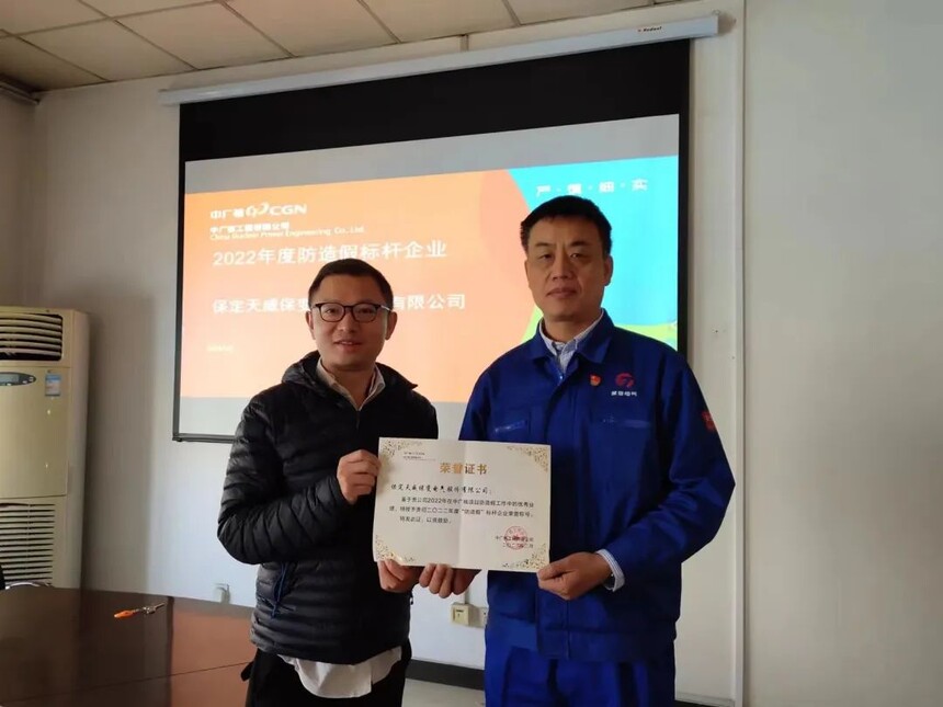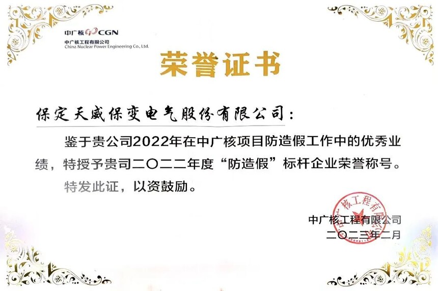 近日,保变电气喜获中广核工程有限公司2022年度防造假标杆企业荣誉证书。此次证书的取得彰显了核电用户对保变电气在质保体系能力、诚信经营、防造假建设、符合性核查方面的高度认可。保变电气为2022年获此荣誉的8家企业之一,为电气板块获此荣誉的独家企业。