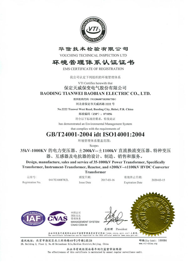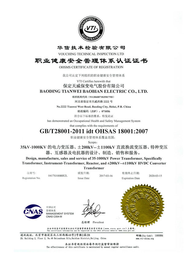 保变电气在质量管理体系方面,同时得到以下主要认证: