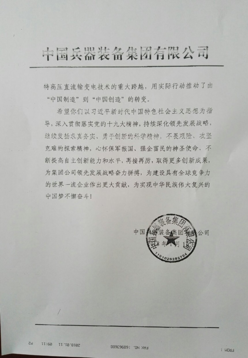 兵装集团公司向保变电气再获国家科学技术进步奖特等奖发来贺信